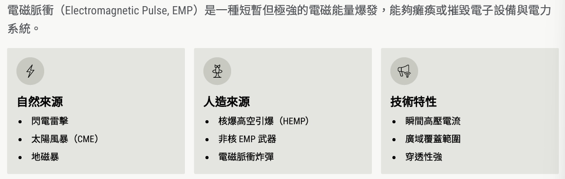 - EMP雖不直接傷人,但可癱瘓資料中心與關鍵系統,影響範圍遠超自然災害。鉑盾科技提供全面EMP防護,確保您的核心技術與資料安全無虞。